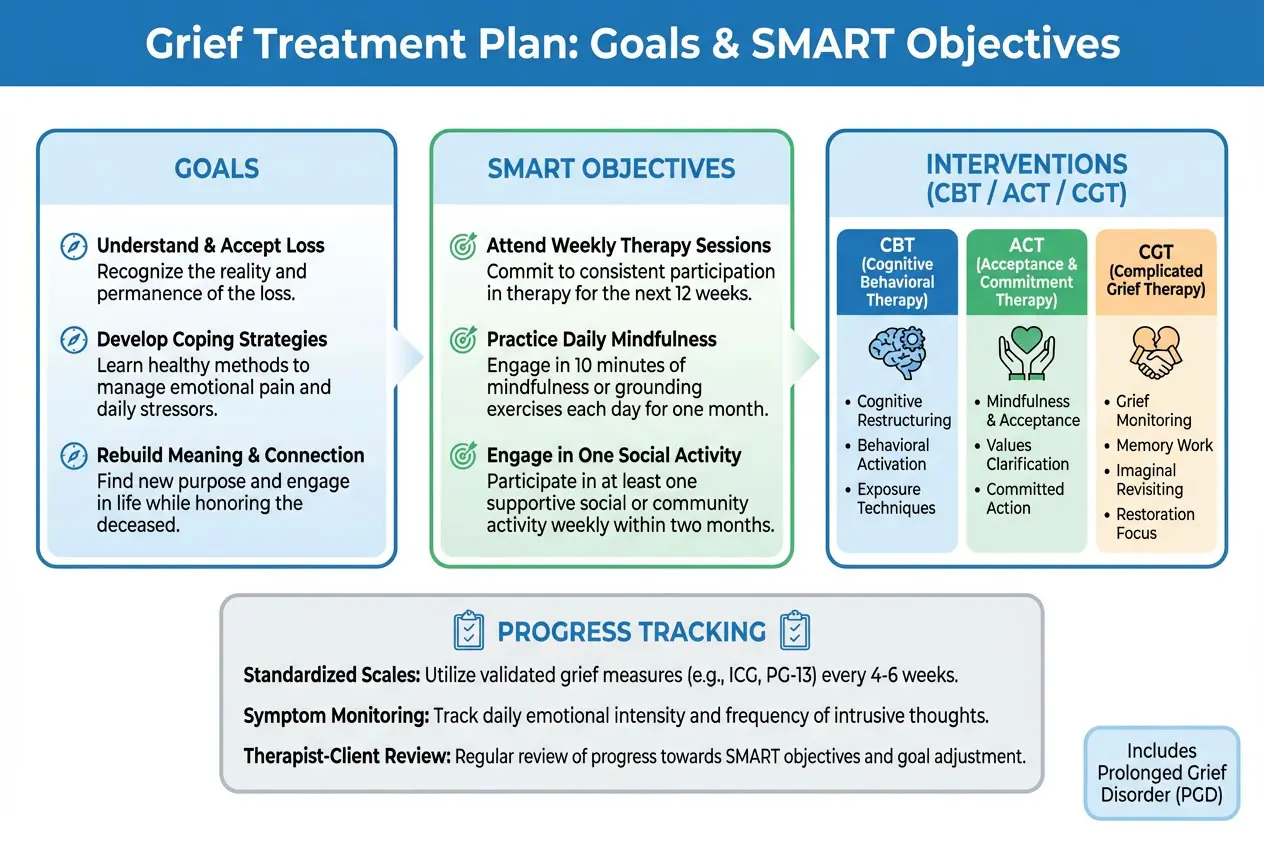 A grief treatment plan outlines structured goals, measurable objectives, and interventions to help clients process loss and improve functioning. This guide includes grief counseling goals, SMART objectives, a sample treatment plan, and specialized approaches for complicated grief and prolonged grief disorder.