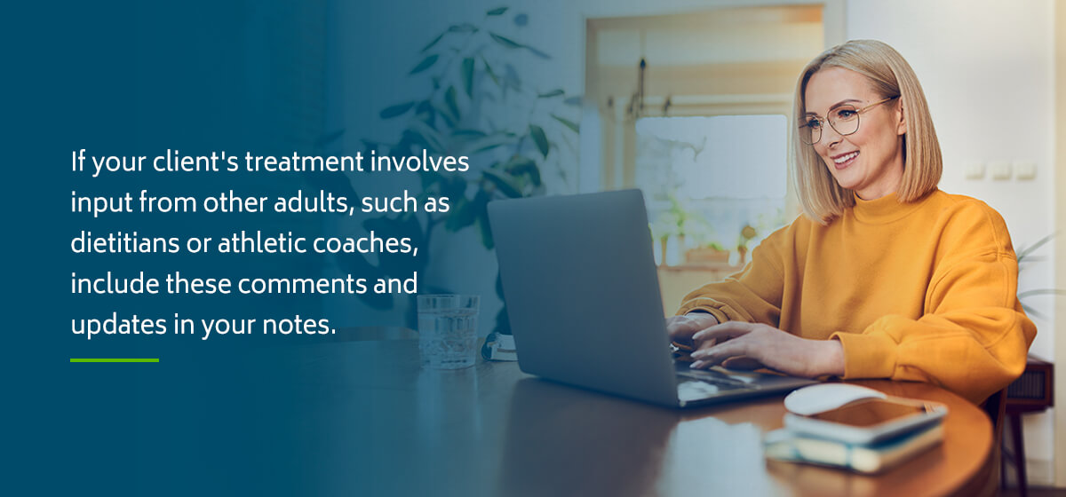If your client's treatment involves input from other adults, such as dietitians or athletic coaches, include these comments and updates in your notes. Even if you do not have direct access to other providers' information, you can ask your client about their progress with them and update your notes accordingly. You'll also want to check in on progress with other treatment approaches, like group therapy or medication.