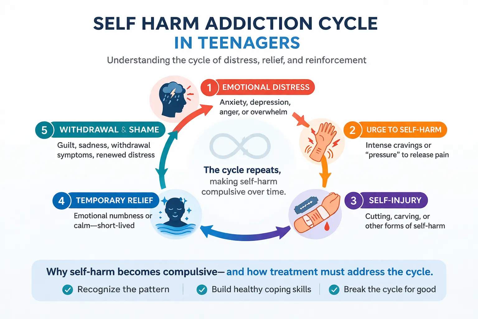 Self harm addiction in teenagers is not simply a behavioral issue — it is a patterned, reinforced cycle that requires targeted intervention.